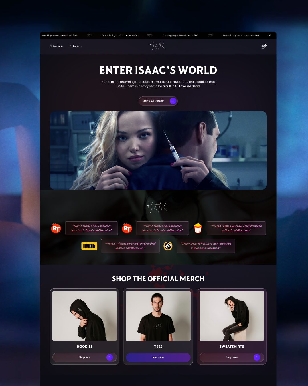 ISSAC Merch is the official merchandise store for the film Love Me Dead. We designed and developed a custom Shopify experience that translates the film’s dark, emotional aesthetic into a functional, scalable e-commerce platform.